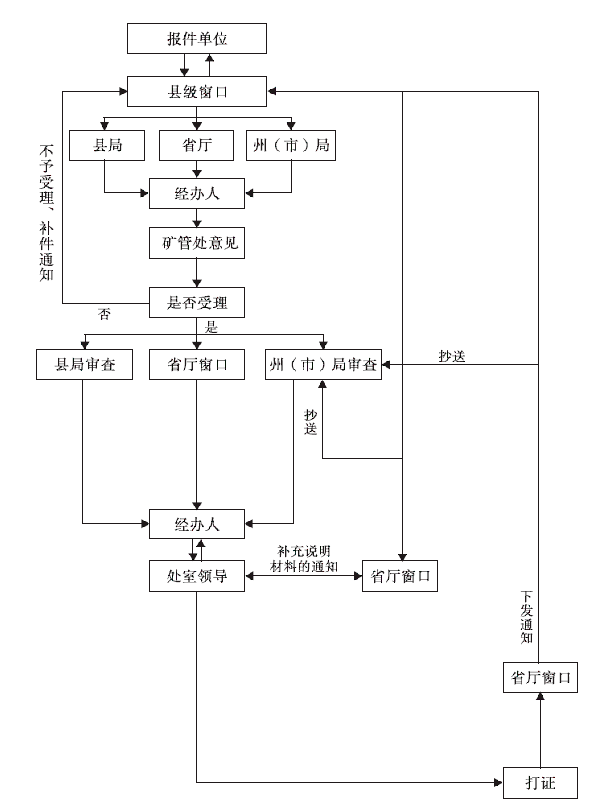 備注:劃定礦區(qū)范圍預(yù)留期過期的,探轉(zhuǎn)采探礦權(quán)存在的,采礦權(quán)申請擴大范圍的,礦區(qū)范圍不予預(yù)留,原申請人可重新申請;探礦權(quán)已滅失和以招、拍、掛和協(xié)議方式直接出讓采礦權(quán)劃定礦區(qū)范圍及資源整合重新劃定礦區(qū)范圍的,申請人說明原因、出具項目所在地(縣、市、區(qū))和州(市)國土資源局有無持劃定礦區(qū)范圍采礦和是否同意延期的意見到省廳辦理延期手續(xù),再次出現(xiàn)過期的,礦區(qū)范圍不予預(yù)留。
